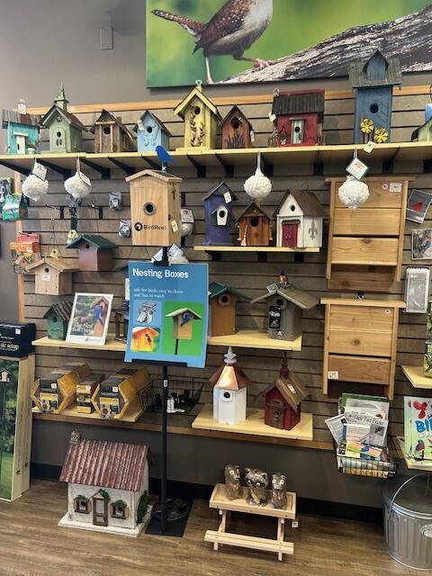 We offer a variety of nesting boxes in every color. Whether it's for your Bluebirds, Wrens or Chickadees, we are your one-stop shop! We can also provide placement advice to ensure the best nest-viewing experience. See our store(s) for details!