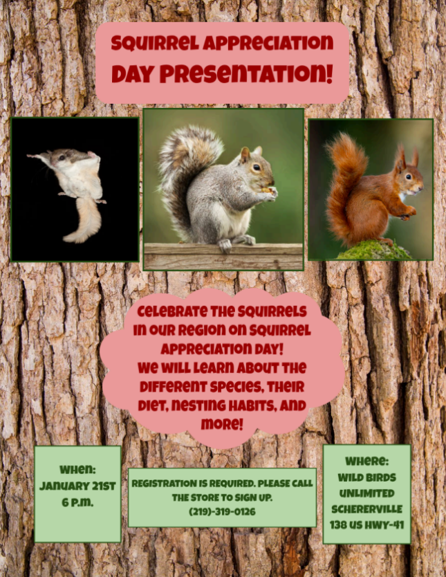 Join us in Schererville for an evening presentation all on squirrels! Learn about the different species, their diet, ways to attract them, and MUCH more! All ages are welcome to come! Plus ones (or two.. or three!) are encouraged!! Snacks will be provided. 😊